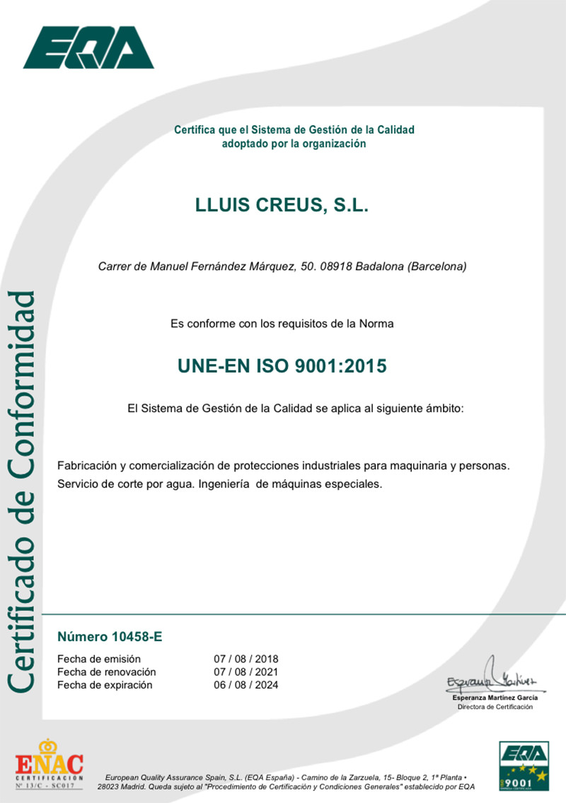 The scope of this certification implies the renewal of the conformity of the integrated management system of the quality standards of the production lines of Lluis Creus S.L. against ISO 9001: 2015 standards.